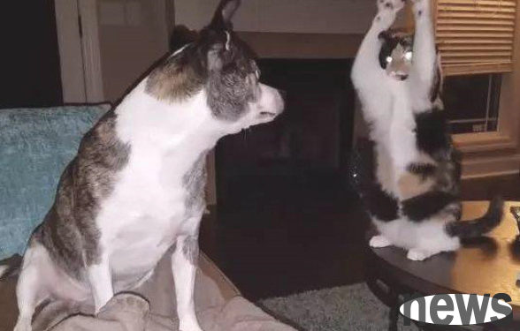 The dog looked suspicious when he saw the cat waving its front paws casually in the air, so he turned around and asked his owner for help. However, the owner was already so happy that he couldn't control himself.
