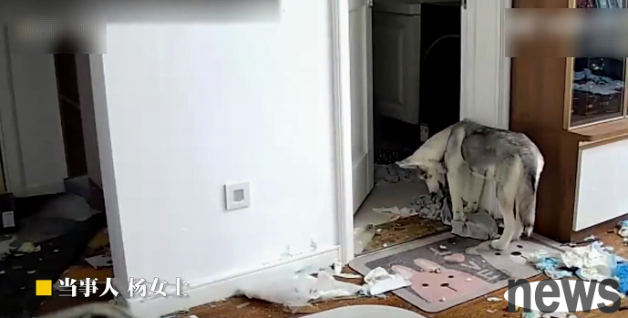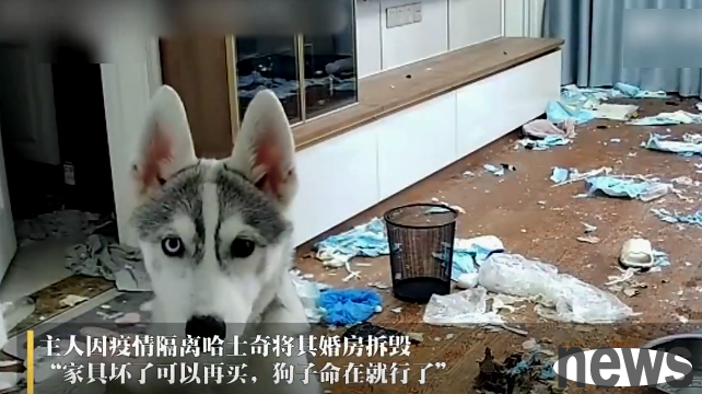 It is reported that Ms. Yang was in a hurry during the quarantine, so she simply packed up the furniture at home and did not have time to give away the husky at home, leaving some dog food and water. When I checked the surveillance, I found that the nearly three-month-old Husky had "teared down" the wedding room.