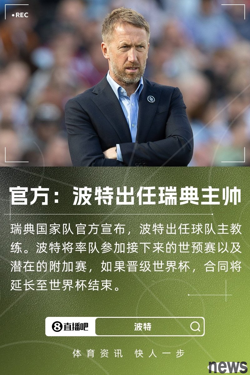 The Swedish Football Association issued an announcement that Porter became the new head coach of the national team. Porter will lead the team to participate in the next World Cup preliminaries and potential play-offs. If they advance to the World Cup, the contract will be extended until the end of the World Cup.
