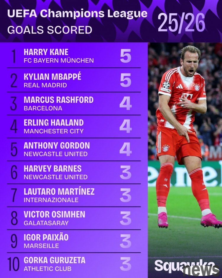 Three rounds have been played in the Champions League this season. Squawka has compiled the Champions League goal rankings so far. Bayern forward Kane and Real Madrid attacker Mbappe have both scored 5 goals, ranking the top two.