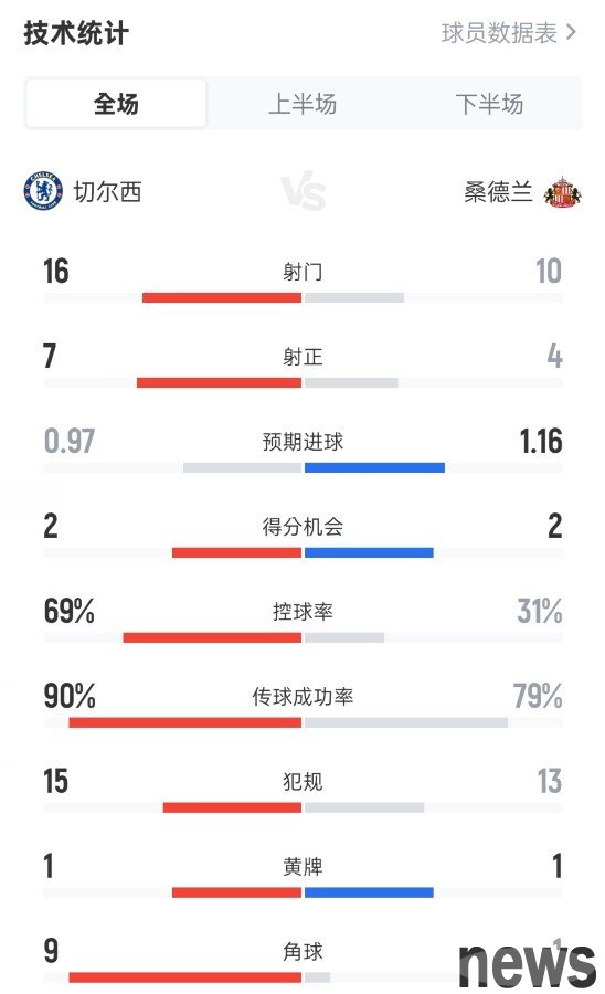 In the 9th round of the 2025-26 Premier League season, Chelsea was defeated by Sunderland 1-2. The statistics of the whole game are as follows: Shots 16-10 Shots on target 7-4 Expected goals 0.97-1.16 Goal opportunities 2-2 Ball possession rate 69%-...