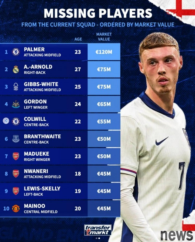 De Zhuan has taken stock of the value list of players who are absent from the current England roster. The details are as follows: 1. Palmer (Chelsea) 120 million euros 2 , Alexander-Arnold (Real Madrid) 75 million euros 3, White (Nottingham Forest)...