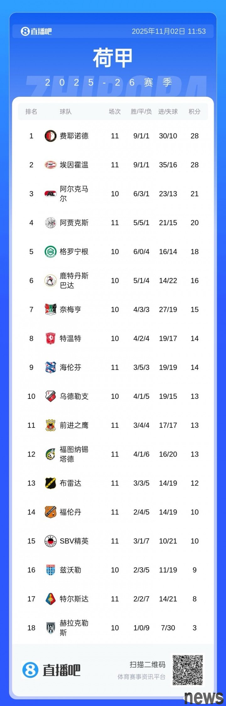 After 11 rounds of the Eredivisie, head coach Robin van Persie led Feyenoord to 9 wins, 1 draw and 1 loss, scoring 30 goals and conceding 10 goals, ranking first in the Eredivisie with 28 points.