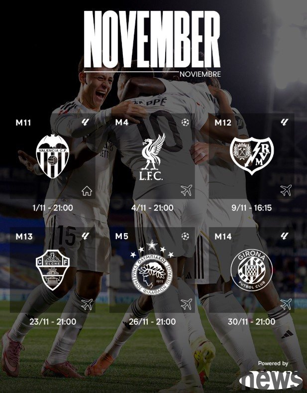 November is coming, and Real Madrid officially released the team schedule. In addition to facing Valencia at home on November 1, the La Liga giants will usher in five consecutive away games, including a trip to Anfield to challenge Liverpool.